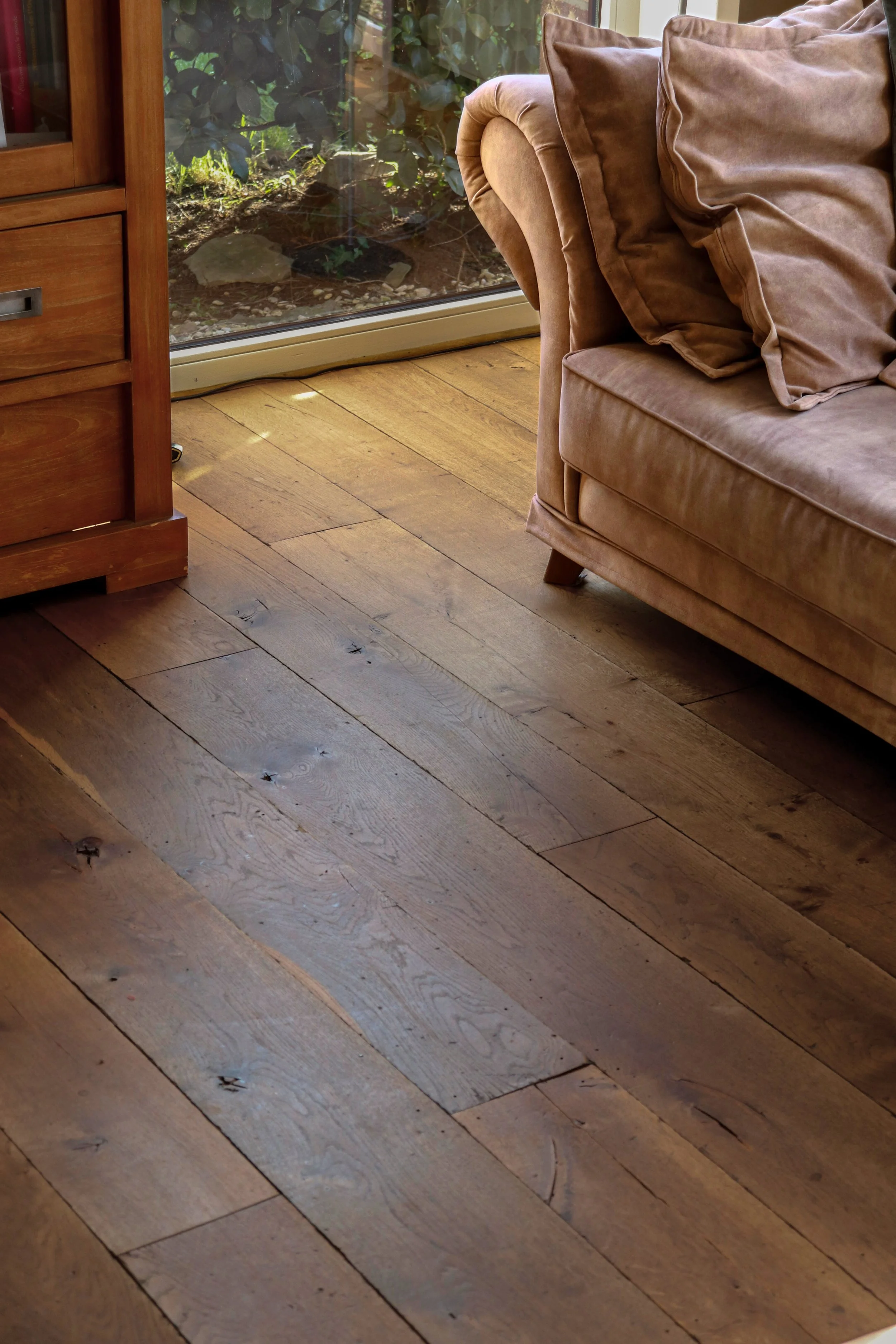 Pour ce projet, notre client recherchait un sol qui raconte une histoire, un bois capable d’installer une atmosphère chaleureuse, texturée et pleine de vie. Le choix s’est porté sur le parquet Montana vieilli, un bois massif travaillé en grandes longueurs et en mélange de largeurs, offrant un rendu à la fois authentique et structurant.